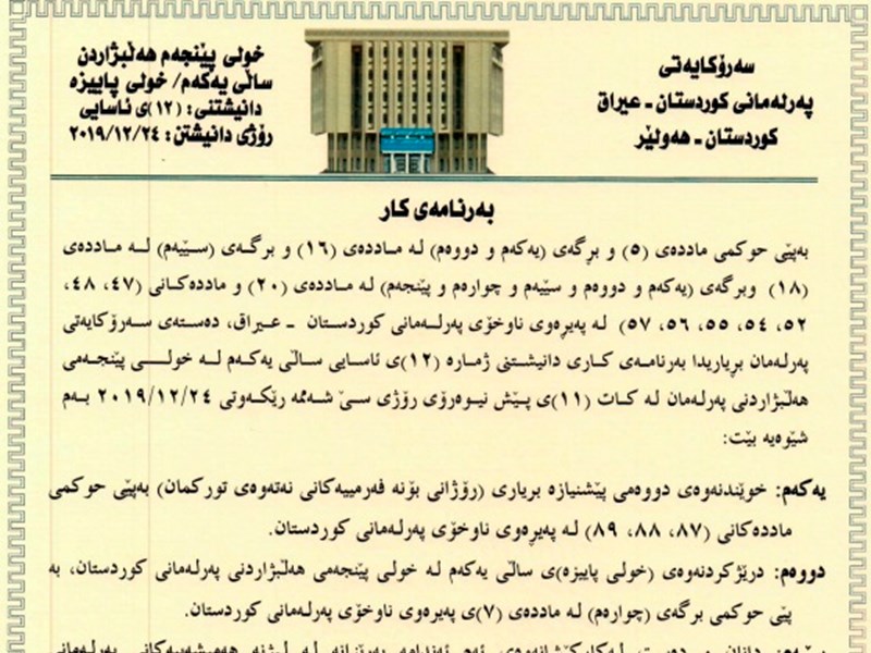 The Presidency of the Kurdistan Parliament announces the order of business for the sitting of Tuesday 24th December 2019 at 11 am – the 12th ordinary sitting of the autumn session of the first year of the Kurdistan Parliament’s fifth term.