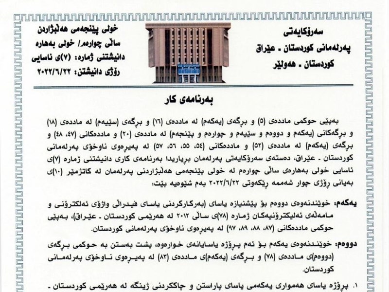 The Speaker of the Kurdistan Parliament Dr. Rewaz Faiq calls MPs to a sitting on Wednesday 22nd June 2022 at 10am, the seventh ordinary sitting of the spring session of the fourth year of the fifth term of Parliament. The Presidency of Parliament announces the order of business of the sitting as follows: