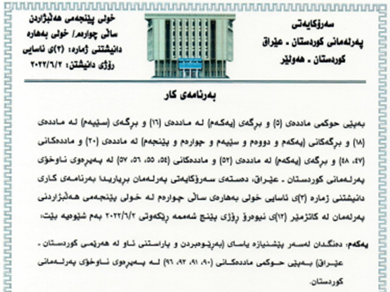 The Speaker of the Kurdistan Parliament Dr. Rewaz Faiq calls MPs to a sitting on Thursday 2nd June 2022 at 12 noon, the third ordinary sitting of the spring session of the fourth year of the fifth term of Parliament. The Presidency of Parliament announces the order of business of the sitting as follows: