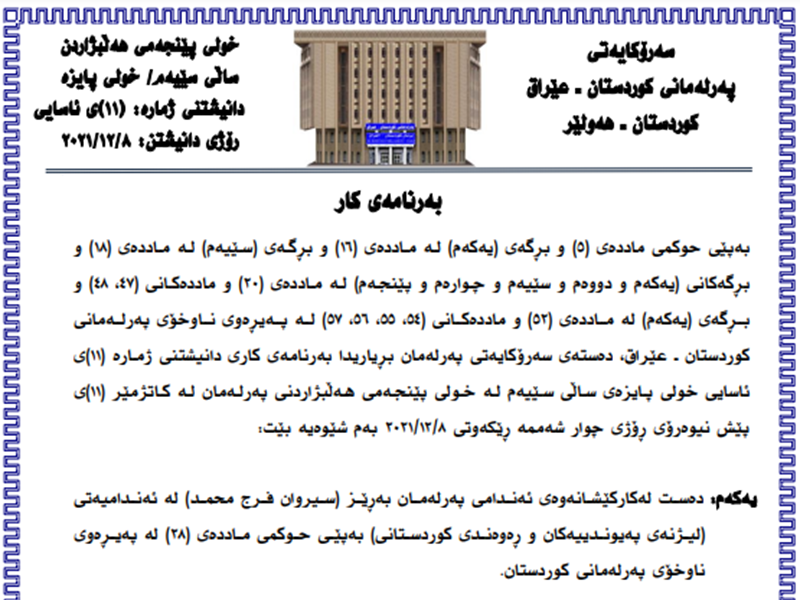 The Speaker of the Kurdistan Parliament Dr. Rewaz Faiq calls MPs to a sitting on Wednesday 8th December 2021 at 11am, the 11th ordinary sitting of the autumn session of the third year of the fifth term of Parliament. The Presidency of Parliament announces the order of business of the sitting as follows: