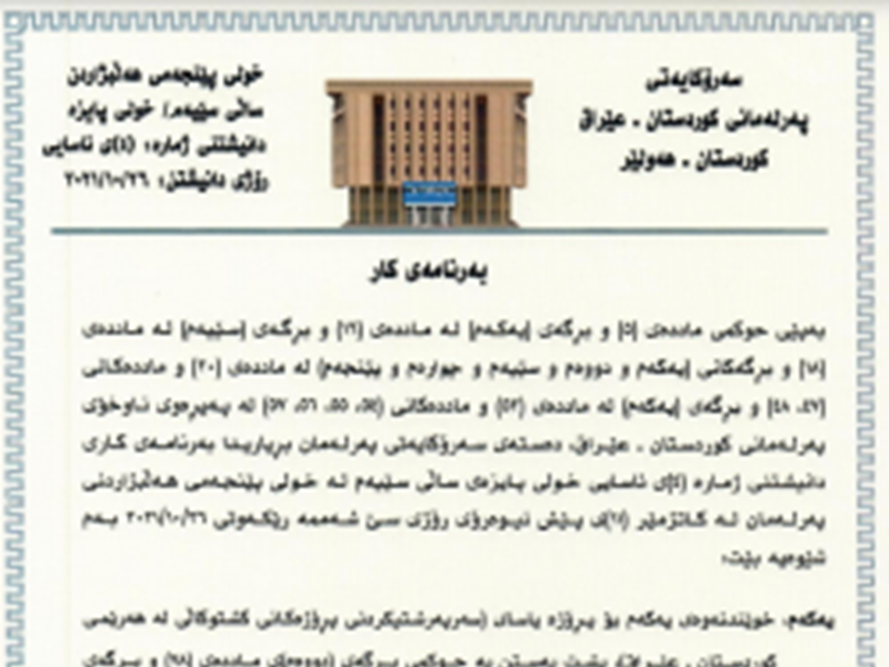 The Speaker of the Kurdistan Parliament Dr. Rewaz Faiq calls MPs to a sitting on Tuesday 26th October 2021 at 11am, the fourth ordinary sitting of the autumn session of the third year of the fifth term of Parliament. The Presidency of Parliament announces the order of business of the sitting as follows: