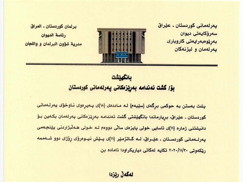 The Speaker of the Kurdistan Parliament calls MPs to a sitting on Monday 30th November 2020 at 11am, the 11th ordinary sitting of the autumn session of the second year of Kurdistan Parliament’s fifth term. The Presidency of Parliament announces the order of business of the sitting as follows: