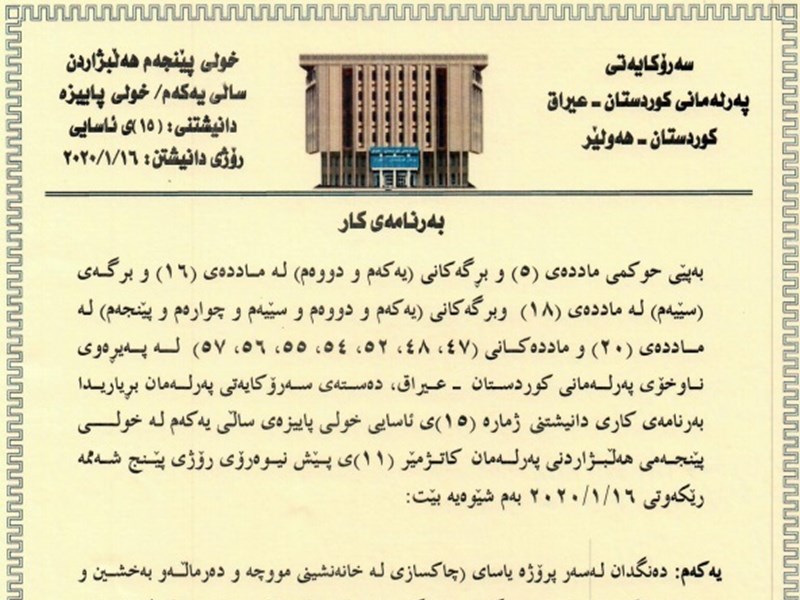 The Presidency of the Kurdistan Parliament announces the order of business for the sitting of Thursday 16th January at 11 am – the 15th ordinary sitting of the autumn session of the first year of the Kurdistan Parliament’s fifth term: