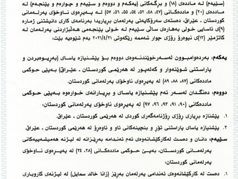 The Speaker of the Kurdistan Parliament Dr. Rewaz Faiq calls MPs to a sitting on Tuesday 27th April 2021 at 11am, the tenth ordinary sitting of the spring session of the third year of the fifth term of Parliament. The Presidency of Parliament announces the order of business of the sitting as follows:
