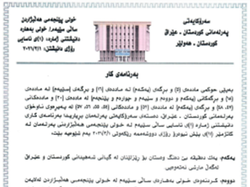 The Speaker of the Kurdistan Parliament calls MPs to a sitting on Monday 1st March 2021 at 11am – the first ordinary sitting of the spring session of the third year of the fifth term of Parliament. The Presidency of Parliament announces the order of business of the sitting as follows: