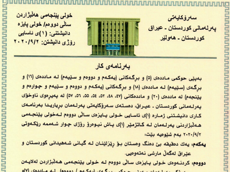 The Presidency of the Kurdistan Parliament announces the order of business for the sitting of Tuesday 8th September 2020 – the third ordinary sitting of the autumn session of the second year of the Kurdistan Parliament’s fifth term: