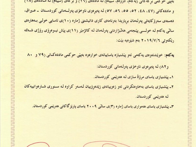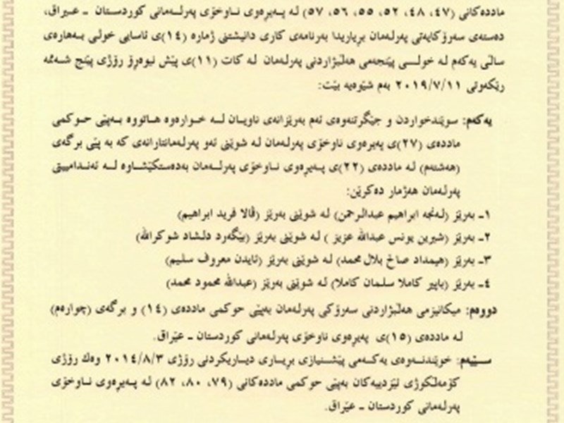 The Presidency of the Kurdistan Parliament announces the order of business for the fifth term’s tenth normal sitting on Saturday 6th July 2019, at 11am:
