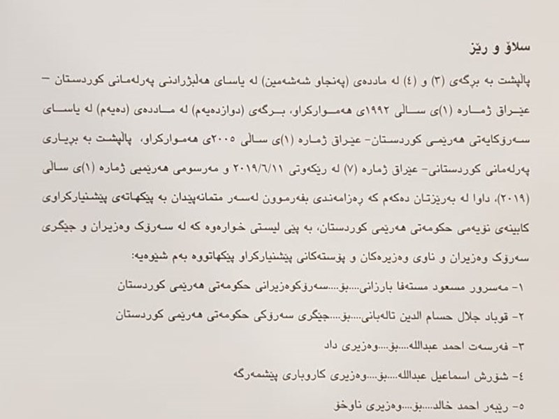 The Presidency of the Kurdistan Parliament announces the order of business for the fifth term’s 13th normal sitting on Wednesday 10th July 2019, at 11am: Giving confidence to the nominated Prime Minister; announcing and giving confidence to the ministers of the ninth cabinet; administering the oath of office to the Prime Minister and his cabinet; and the Prime Minister's announcement of the main points of the ninth cabinet's programme.