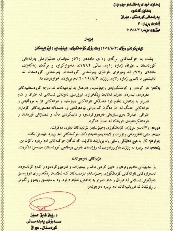 Kurdistan Parliament publishes Resolution no. 11 of 2019 on Yazidi Genocide