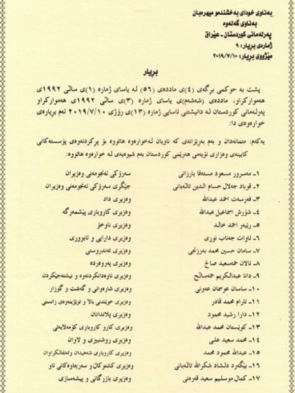 - Resolution no. 9 on the Kurdistan Parliament’s majority votes of confidence to the Prime Minister and the ministerial candidates of the ninth KRG cabinet