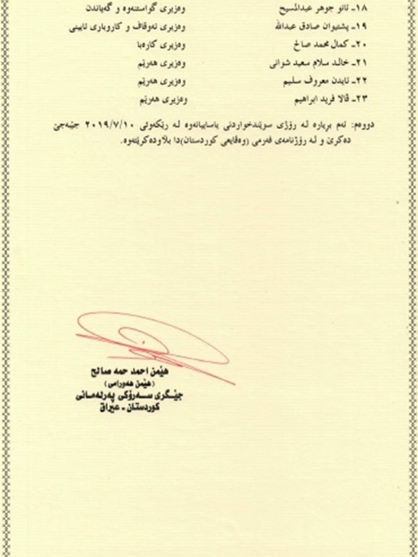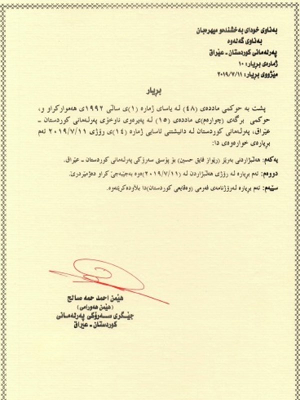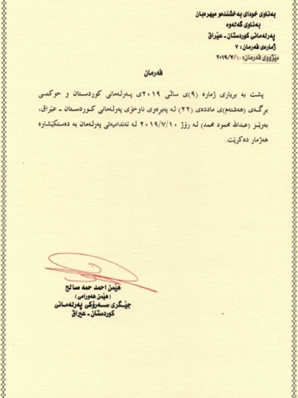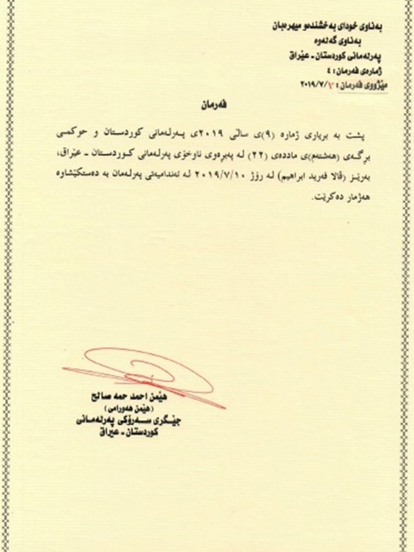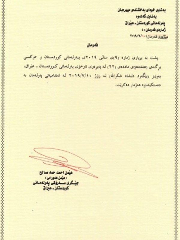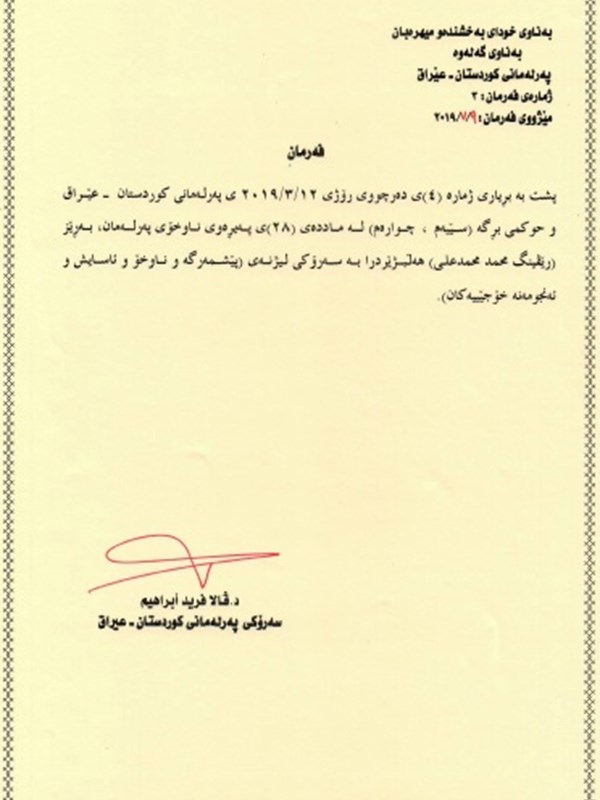 - Order no. 3 on the election of Reving Heruri (KDP) as new Chair of the Kurdistan Parliament Committee on Peshmerga, Interior, Security and Local Councils