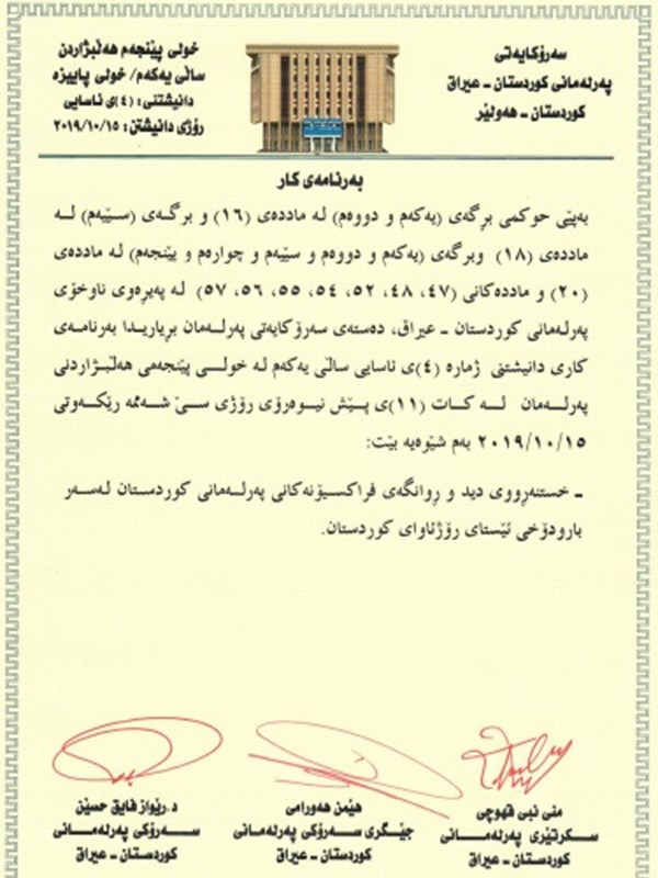The Presidency of the Kurdistan Parliament announces the order of business for the sitting of Tuesday 15th October at 11am - the fourth sitting of the autumn session of the first year of the Kurdistan Parliament’s fifth term: