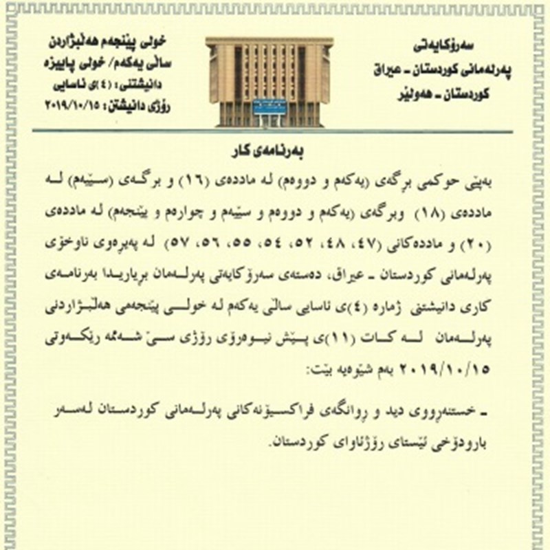 The Presidency of the Kurdistan Parliament decides and announces the order of business of this sitting according to Parliament’s Internal Rules of Procedure, Article 16 (paragraphs 1, 2), Article 18 (paragraph 3), Article 20 (paragraphs 1, 2, 3, 4, 5) and Articles 47, 48, 52, 54, 55, 56 and 57.