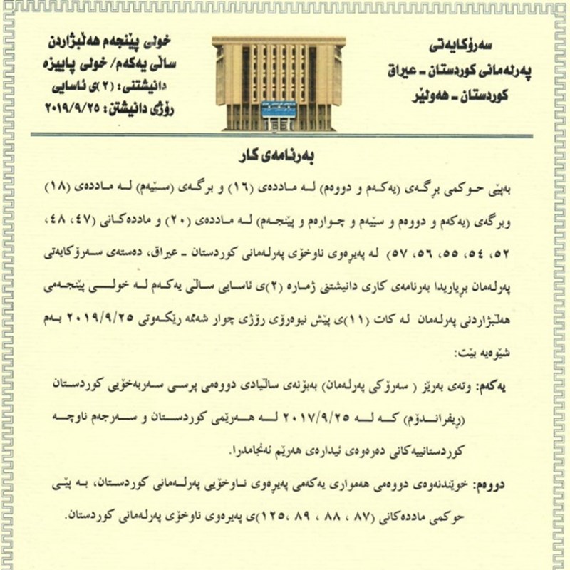The Presidency of the Kurdistan Parliament announces the order of business for the sitting of Wednesday 25th September at 11am - the second sitting of the autumn session of the first year of the Kurdistan Parliament’s fifth term.