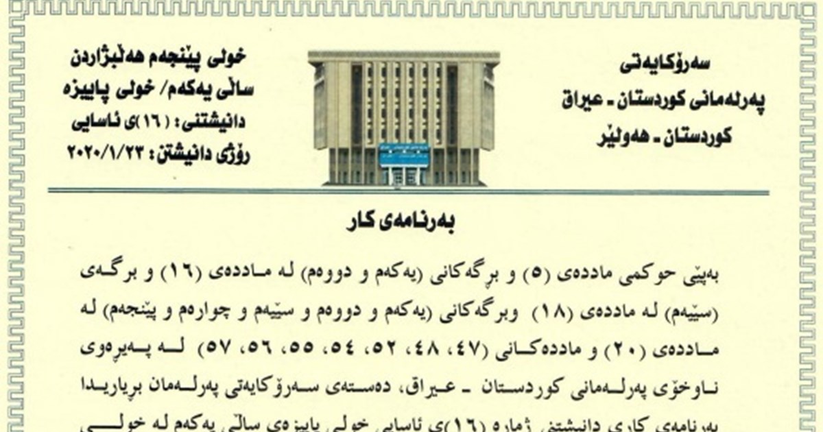 The Presidency of the Kurdistan Parliament announces the order of business for the sitting of Thursday 23rd January at 11 am – the 16th ordinary sitting of the autumn session of the first year of the Kurdistan Parliament’s fifth term:
