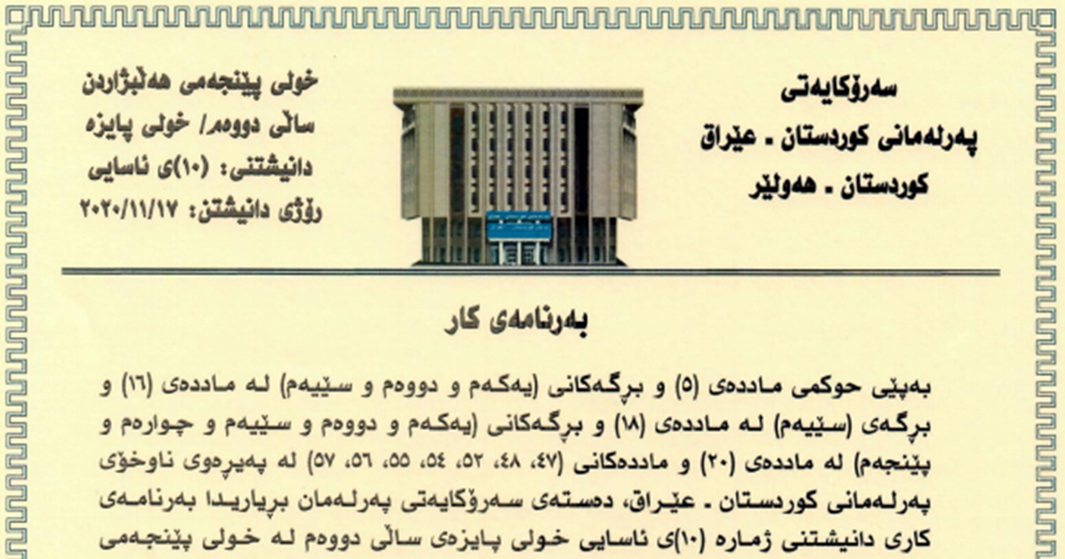 The Speaker of the Kurdistan Parliament calls MPs to a sitting on Tuesday 17 November 2020 at 11am – the tenth ordinary sitting of the autumn session of the second year of the Kurdistan Parliament’s fifth term. The Presidency of Parliament announces the order of business of the sitting as follows: