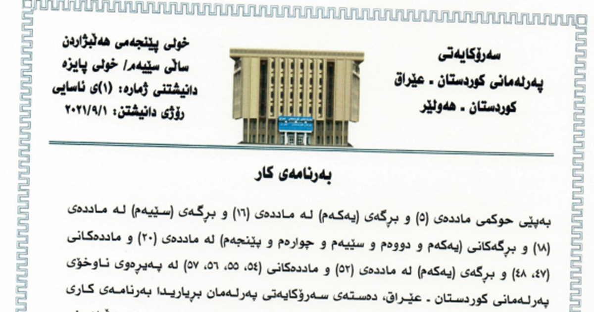 The Presidency of the Kurdistan Parliament decides and announces the order of business of this sitting according to Parliament’s Internal Rules of Procedure, Article 5, Article 16 (paragraph 1), Article 18 (paragraph 3), Article 20 (paragraphs 1, 2, 3, 4, 5), articles 47 and 48, Article 52 (paragraph 1) and articles 54, 55, 56 and 57.