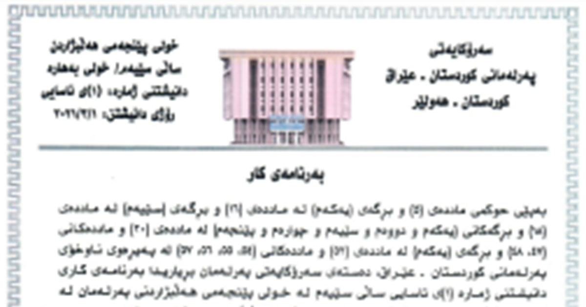 The Presidency of the Kurdistan Parliament decides and announces the order of business of this sitting according to Parliament’s Internal Rules of Procedure, Article 5, Article 16 (paragraph 1), Article 18 (paragraph 3), Article 20 (paragraphs 1, 2, 3, 4, 5), and articles 47, 48, Article 52 (paragraph 1), and articles 54, 55, 56 and 57.