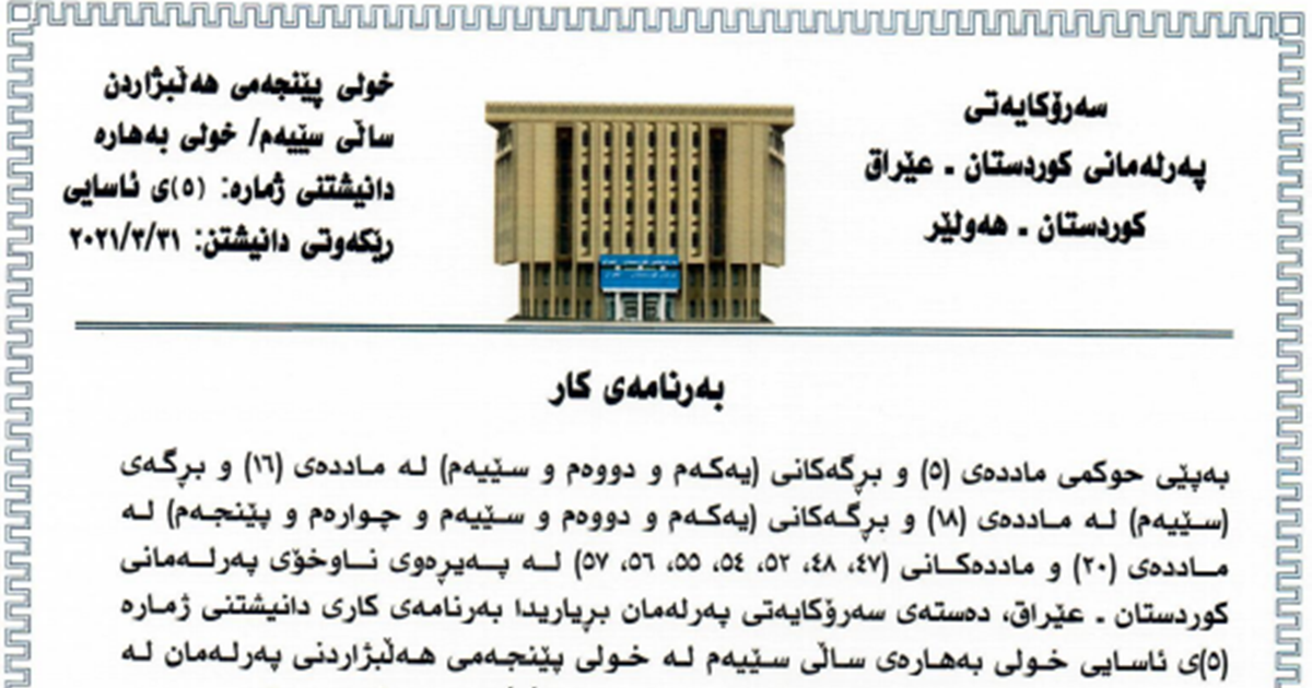 The Presidency of the Kurdistan Parliament decides and announces the order of business of this sitting according to Parliament’s Internal Rules of Procedure, Article 5, Article 16 (paragraph 1), Article 18 (paragraph 3), Article 20 (paragraphs 1, 2, 3, 4, 5), and articles 47, 48, 52, 54, 55, 56 and 57.