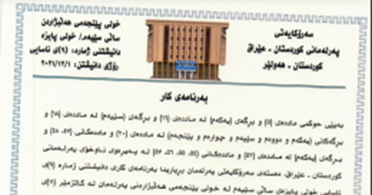 The Presidency of the Kurdistan Parliament decides and announces the order of business of this sitting according to Parliament’s Internal Rules of Procedure, Article 5, Article 16 (paragraph 1), Article 18 (paragraph 3), Article 20 (paragraphs 1, 2, 3, 4, 5), articles 47 and 48, Article 52 (paragraph 1) and articles 54, 55, 56 and 57.