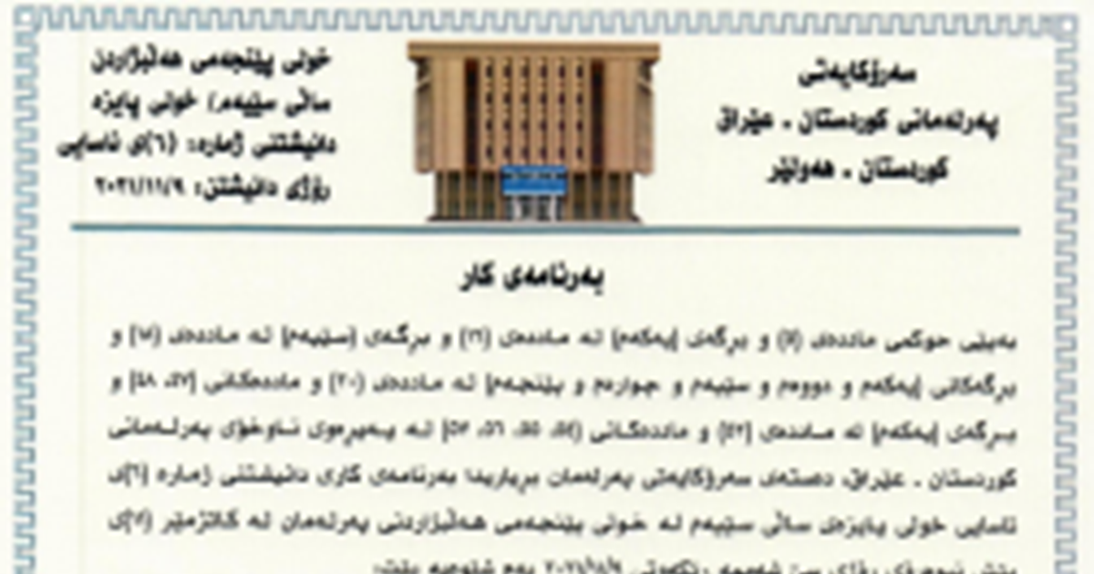 The Presidency of the Kurdistan Parliament decides and announces the order of business of this sitting according to Parliament’s Internal Rules of Procedure, Article 5, Article 16 (paragraph 1), Article 18 (paragraph 3), Article 20 (paragraphs 1, 2, 3, 4, 5), and articles 47, 48, 52 (paragraph 1), 54, 55, 56 and 57.