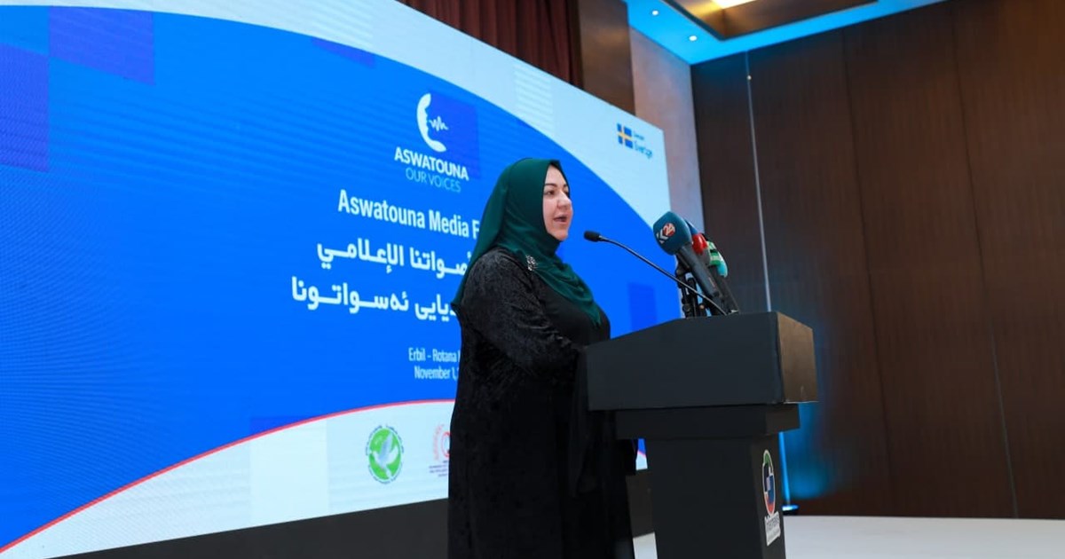 Speaker Dr. Rewaz Faiq gives speech at Women's Media Festival in Erbil