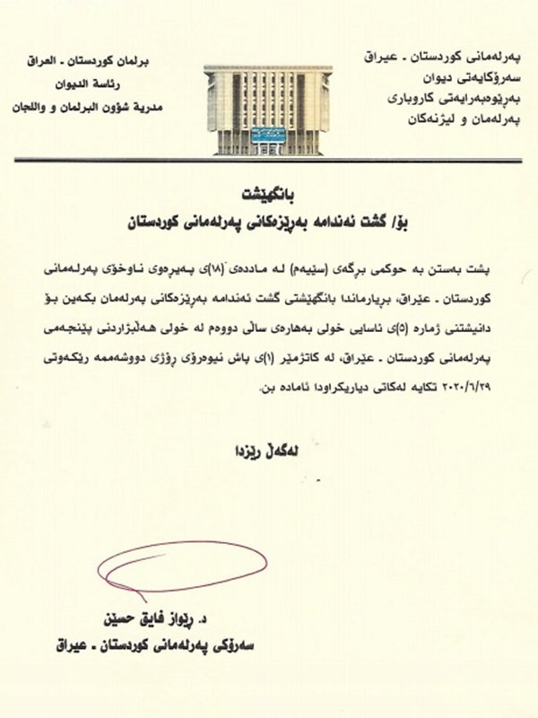 وجاء في نص الدعوة: "استناداً لأحكام الفقرة الثالثة من المادة (18) من النظام الداخلي لبرلمان كوردستان - العراق، قررنا دعوة جميع السادة أعضاء البرلمان للجلسة الاعتيادية رقم (5)، في السنة الثانية للدورة التشريعية الخامسة لبرلمان كوردستان، في الساعة 1 من يوم الاثنين الموافق 29/6/2020 ، لذا يرجى الحضور في الوقت المحدد".