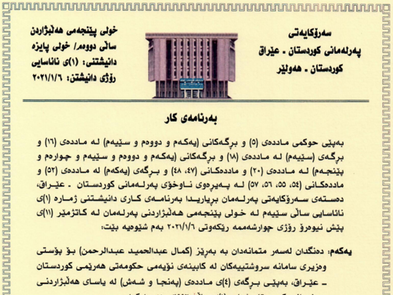 The Speaker of the Kurdistan Parliament calls MPs to the first extraordinary sitting of the third year of the fifth term of the Kurdistan Parliament on Wednesday 6th January 2021 at 11am. The Presidency of Parliament announces the order of business of the sitting as follows: