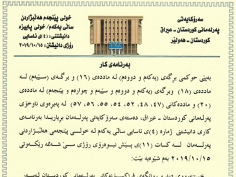 The Presidency of the Kurdistan Parliament announces the order of business for the sitting of Tuesday 15th October at 11am: The parties in the Kurdistan Parliament will give their views and observations on the current situation and events in Rojava (Western Kurdistan).