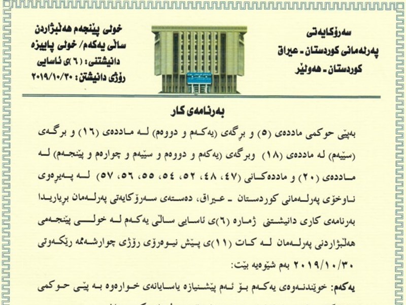 The Presidency of the Kurdistan Parliament announces the order of business for the sitting of Wednesday 30th October at 11am - the sixth sitting of the autumn session of the first year of the Kurdistan Parliament’s fifth term.