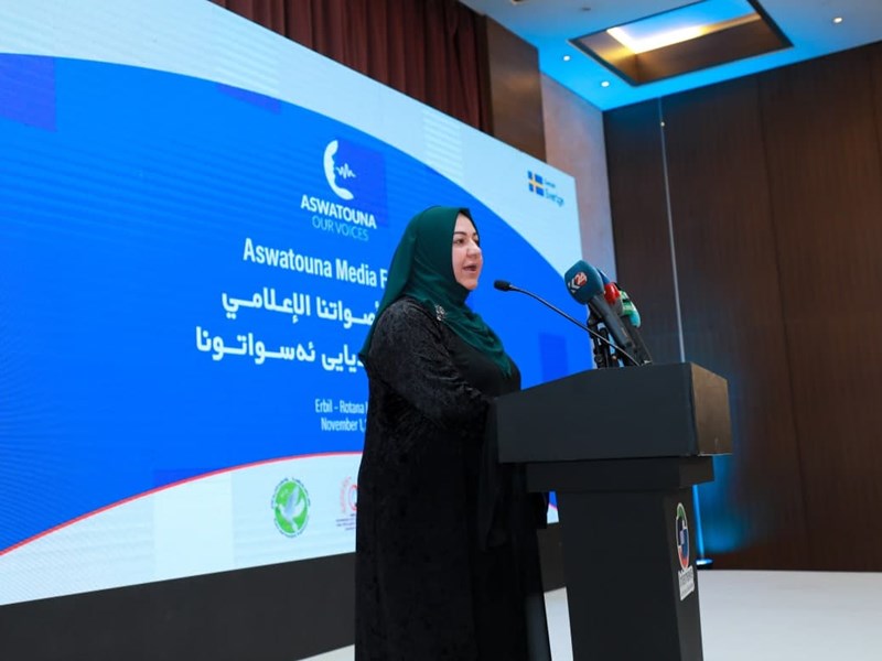 Speaker Dr. Rewaz Faiq gives speech at Women's Media Festival in Erbil