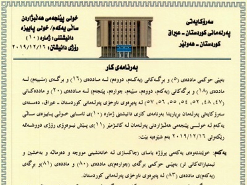 The Presidency of the Kurdistan Parliament announces the order of business for the sitting of Monday 16th December 2019 at 11 am – the tenth ordinary sitting of the autumn session of the first year of the Kurdistan Parliament’s fifth term: