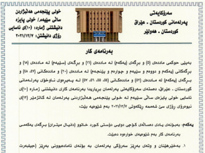 The Speaker of the Kurdistan Parliament Dr. Rewaz Faiq calls MPs to a sitting on Tuesday 7th December 2021 at 12 noon, the 10th ordinary sitting of the autumn session of the third year of the fifth term of Parliament. The Presidency of Parliament announces the order of business of the sitting as follows: