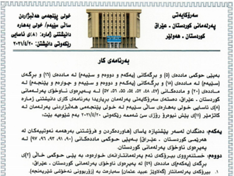 The Speaker of the Kurdistan Parliament Dr. Rewaz Faiq calls MPs to a sitting on Tuesday 20 April 2021 at 11am, the eighth ordinary sitting of the spring session of the third year of the fifth term of Parliament. The Presidency of Parliament announces the order of business of the sitting as follows: