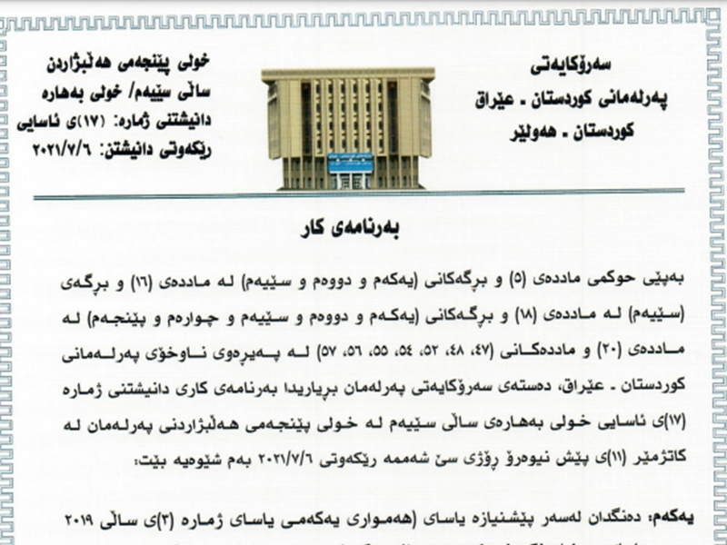 The Speaker of the Kurdistan Parliament Dr. Rewaz Faiq calls MPs to a sitting on Tuesday 6th July 2021 at 11am, the 17th ordinary sitting of the spring session of the third year of the fifth term of Parliament. The Presidency of Parliament announces the order of business of the sitting as follows: