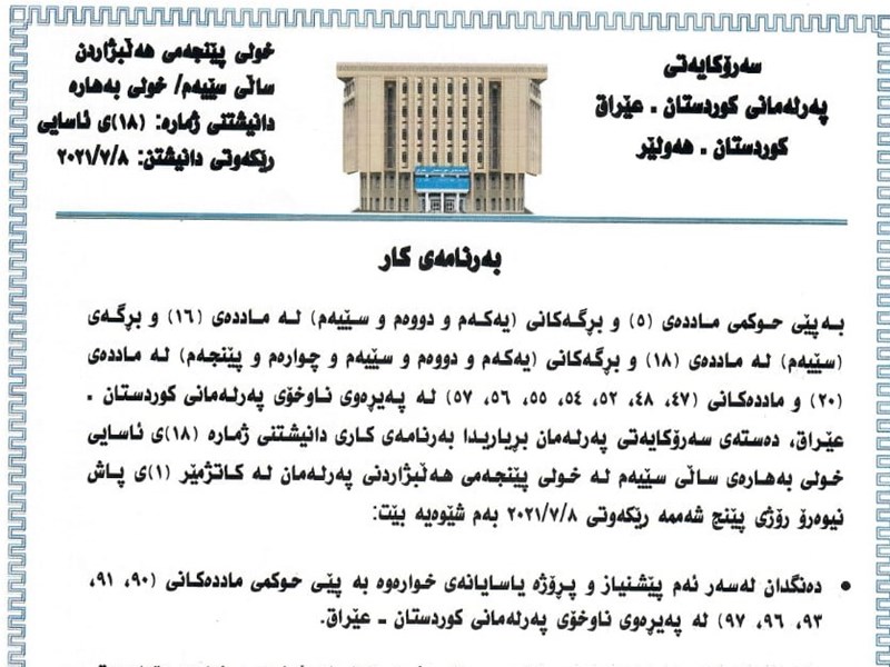 The Speaker of the Kurdistan Parliament Dr. Rewaz Faiq calls MPs to a sitting on Thursday 8th July 2021 at 1pm, the 18th ordinary sitting of the spring session of the third year of the fifth term of Parliament. The Presidency of Parliament announces the order of business of the sitting as follows:
