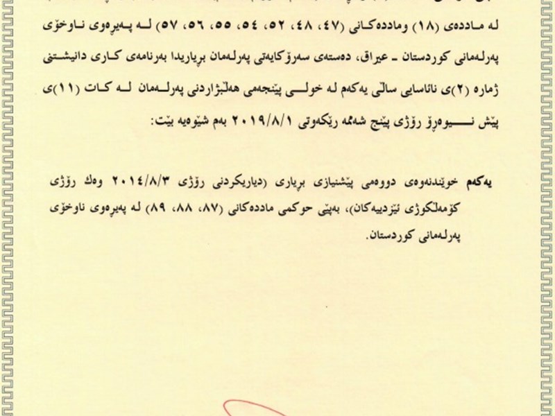 The Kurdistan Parliament publishes online recent orders and resolutions that were issued in the month of July. They are resolutions or orders on the election of Parliament Speaker Dr. Rewas Faiq Hussein; Parliament’s majority vote of confidence in the ninth KRG cabinet Prime Minister and ministers; the election of Reving Heruri as new chair of a committee; and the automatic relinquishment of Parliament membership for MPs that were appointed as ministers.