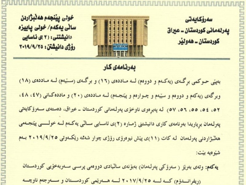The Presidency of the Kurdistan Parliament announces the order of business for the sitting of Wednesday 25th September at 11am - the second sitting of the autumn session of the first year of the Kurdistan Parliament’s fifth term.