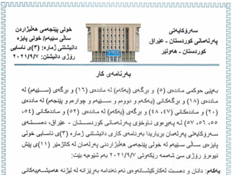The Speaker of the Kurdistan Parliament Dr. Rewaz Faiq calls MPs to a sitting on Tuesday 7th September 2021 at 11am, the third ordinary sitting of the autumn session of the third year of the fifth term of Parliament. The Presidency of Parliament announces the order of business of the sitting as follows: