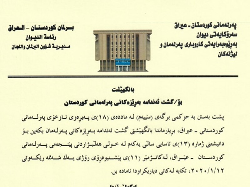 9 January - The Speaker of the Kurdistan Parliament Dr. Rewas Faiq calls MPs to an ordinary sitting on Sunday 12th January at 11am.