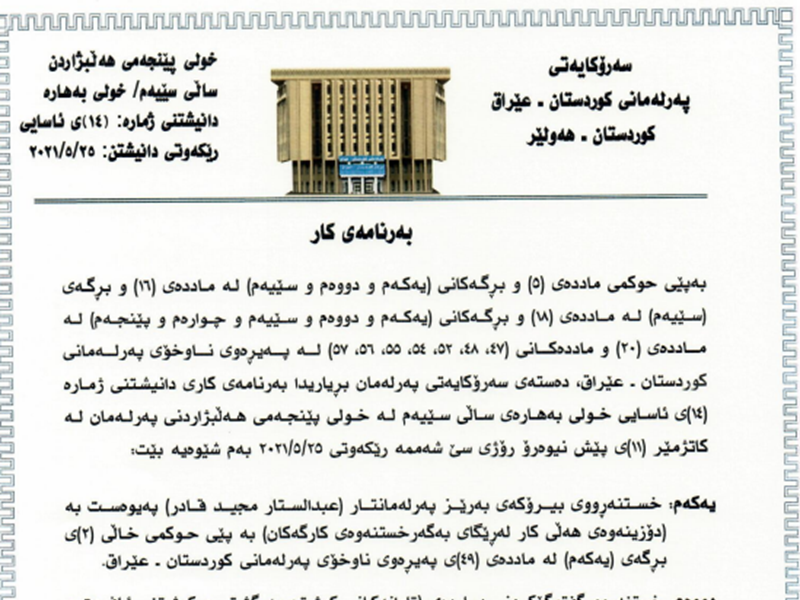 The Speaker of the Kurdistan Parliament Dr. Rewaz Faiq calls MPs to a sitting on Tuesday 25 May 2021 at 11am, the 14th ordinary sitting of the spring session of the third year of the fifth term of Parliament. The Presidency of Parliament announces the order of business of the sitting as follows: