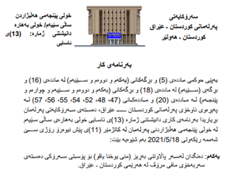The Speaker of the Kurdistan Parliament Dr. Rewaz Faiq calls MPs to a sitting on Tuesday 18th May 2021 at 11am, the 13th ordinary sitting of the spring session of the third year of the fifth term of Parliament. The Presidency of Parliament announces the order of business of the sitting as follows: