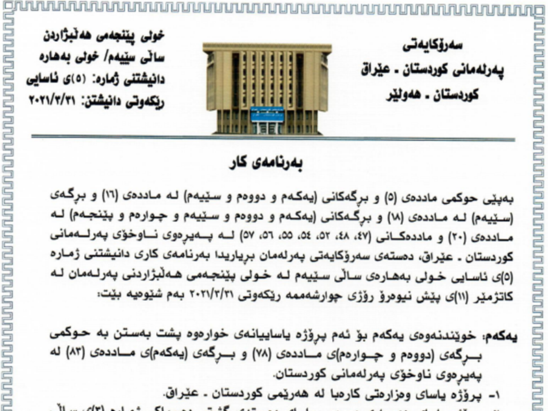 The Speaker of the Kurdistan Parliament Dr. Rewaz Faiq calls MPs to a sitting on Wednesday 31st March 2021 at 11am – the fifth ordinary sitting of the spring session of the third year of the fifth term of Parliament. The Presidency of Parliament announces the order of business of the sitting as follows: