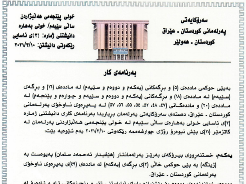 The Speaker of the Kurdistan Parliament Dr. Rewaz Faiq calls MPs to a sitting on Monday 10th March 2021 at 11am – the third ordinary sitting of the spring session of the third year of the fifth term of Parliament. The Presidency of Parliament announces the order of business of the sitting as follows: