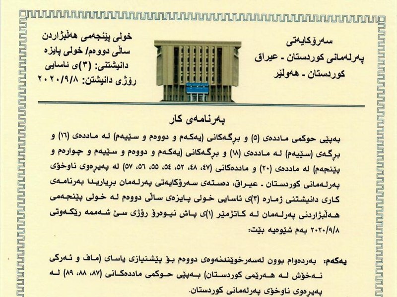 The Presidency of the Kurdistan Parliament announces the order of business for the sitting of Tuesday 8th September 2020 – the third ordinary sitting of the autumn session of the second year of the Kurdistan Parliament’s fifth term: