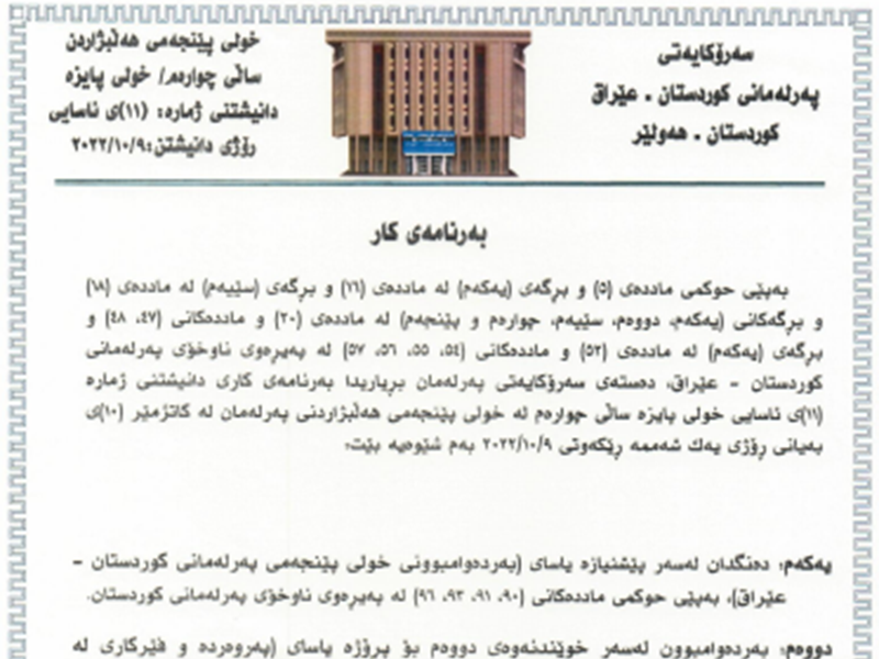 The Speaker of the Kurdistan Parliament Dr. Rewaz Faiq calls MPs to a sitting on Sunday 9th October 2022 at 10am, the 11th ordinary sitting of the autumn session of the fourth year of the fifth term of Parliament. The Presidency of Parliament announces the order of business of the sitting as follows: