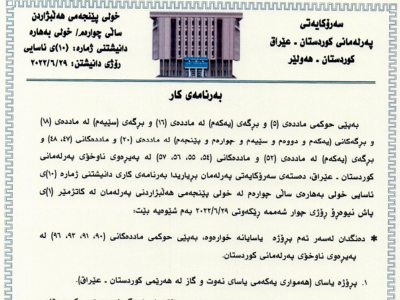 The Speaker of the Kurdistan Parliament Dr. Rewaz Faiq calls MPs to a sitting on Wednesday 29th June 2022 at 1pm, the 10th ordinary sitting of the spring session of the fourth year of the fifth term of Parliament. The Presidency of Parliament announces the order of business of the sitting as follows: