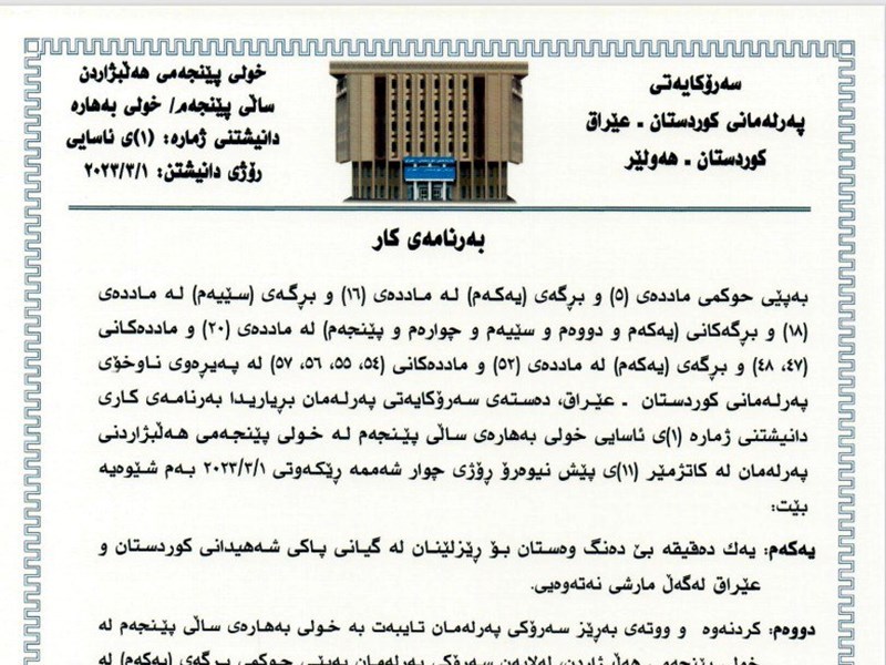 The Speaker of the Kurdistan Parliament Dr. Rewaz Faiq calls MPs to a sitting on Wednesday 1st March 2023 at 11am, the 1st ordinary sitting of the spring session of the fifth year of the fifth term of Parliament. The Presidency of Parliament announces the order of business of the sitting as follows: