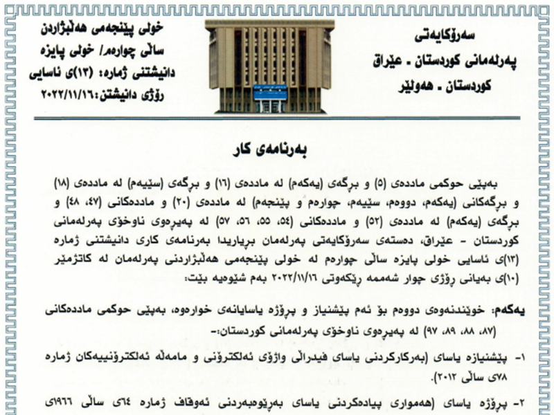The Speaker of the Kurdistan Parliament Dr. Rewaz Faiq calls MPs to a sitting on Wednesday 16th November 2022 at 10am, the 13th ordinary sitting of the autumn session of the fourth year of the fifth term of Parliament. The Presidency of Parliament announces the order of business of the sitting as follows: