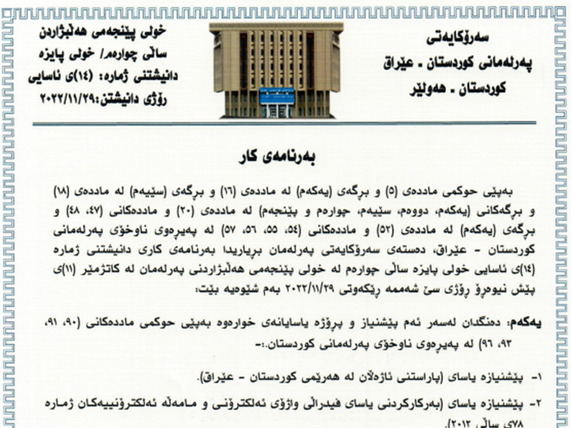 The Speaker of the Kurdistan Parliament Dr. Rewaz Faiq calls MPs to a sitting on Tuesday 29th November 2022 at 11am, the 14th ordinary sitting of the autumn session of the fourth year of the fifth term of Parliament. The Presidency of Parliament announces the order of business of the sitting as follows: